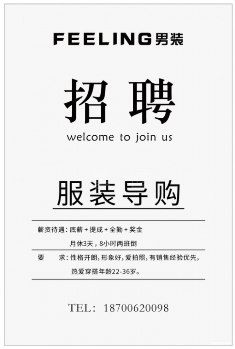 招聘男装导购,底薪➕提成➕奖金➕全勤22岁至36岁,性格活泼开朗,自信,形...